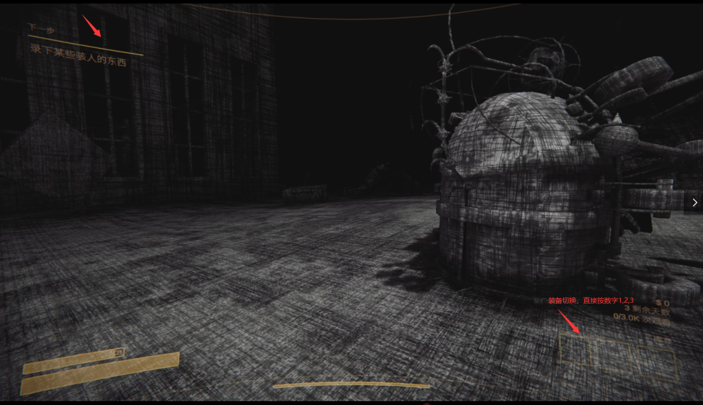 3)、下潜到水底后呢,就按照左上角的游戏提示拍摄到恐怖的东西,后就可以返回到水面上了。但是在水底要小心,水底是很危险的,很容易就被怪物杀掉,被怪物杀掉后,就没法复活的。如果你有装备,也可以通过按数字来切换装备。如下如所示: